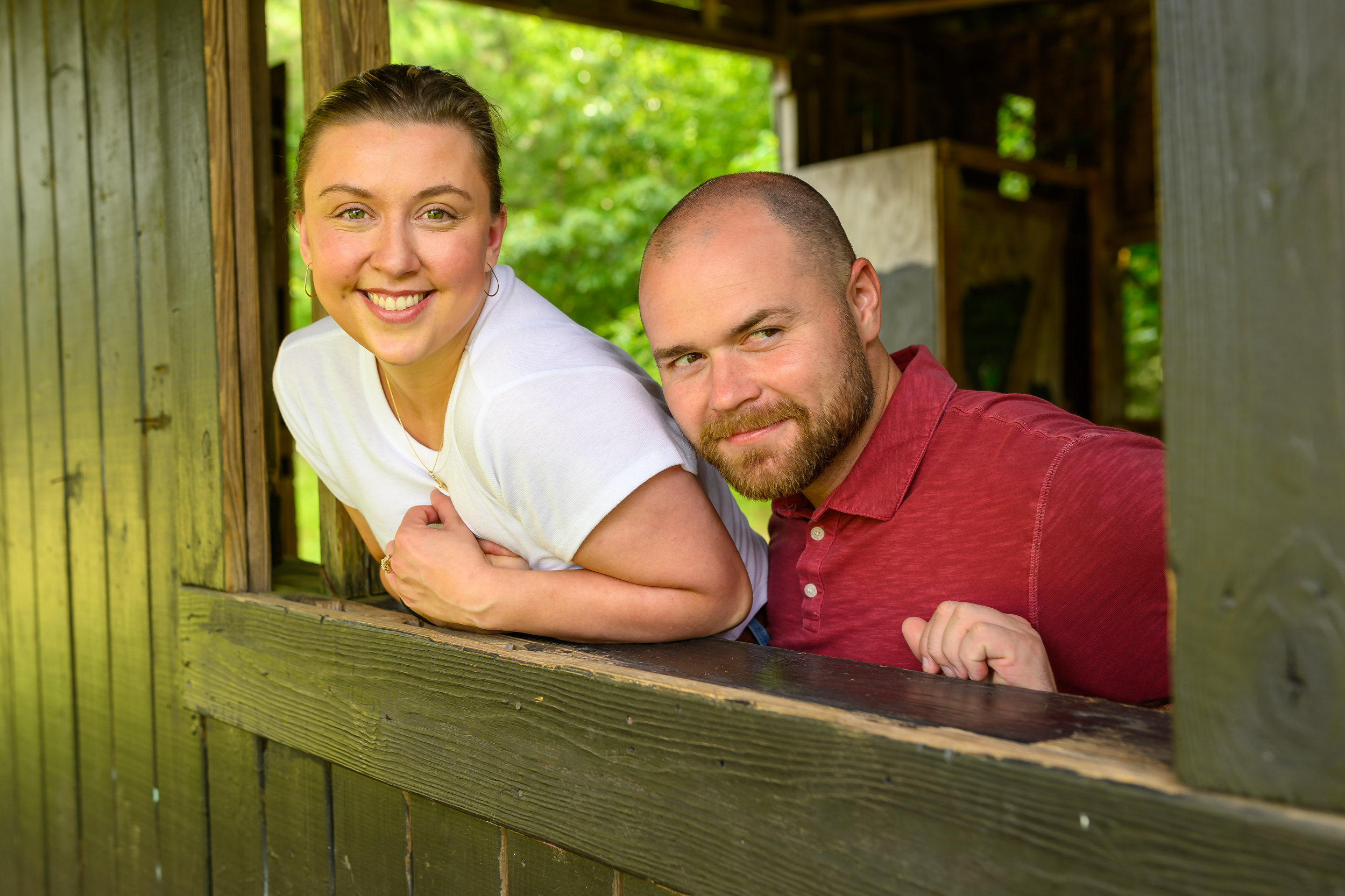We met at 9 a.m. for this engagement session to avoid the heat and the predicted afternoon rain. We chose a 200-acre city park that feels more like a hidden preserve. Wooded trails, open meadows, and rustic structures gave us variety and charm.