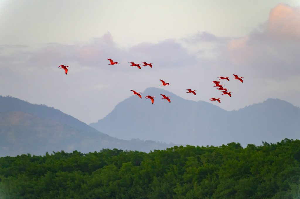 The Scarlet Ibis, locally known as “flamingo,” makes its home in the Caroni Bird Sanctuary in the Caroni Swamp–an area set aside by the government for the protection of these colorful birds. The Caroni Swamp includes fifteen thousand acres of marshland, tidal lagoons, and mangrove trees. Several thousand Scarlet Ibises nest and roost in the sanctuary and are often seen in large numbers during the last two hours of daylight. Larger numbers of Scarlet Ibises can be seen during the breeding season, from April to August. These birds feed mainly on crabs, which they seek out on the mud flats exposed at low tide and on the stilt roots of the red mangrove.